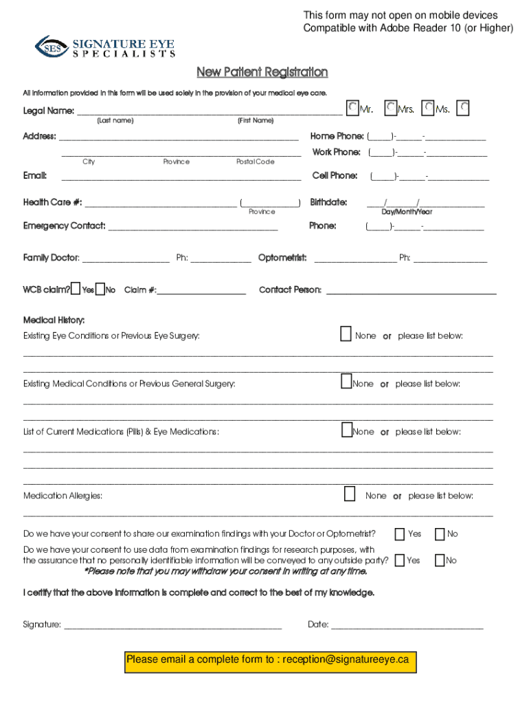 This form may not open on mobile devices Compatible with Adobe Reader 10 (or Higher)New Patient Registration All information provided in this form will be used solely in the provision of your medical