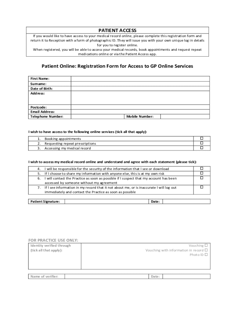 PATIENT ACCESS If you would like to have access to your medical record online, please complete this registration form and return it to Reception with a form of photographic ID. They will issue you