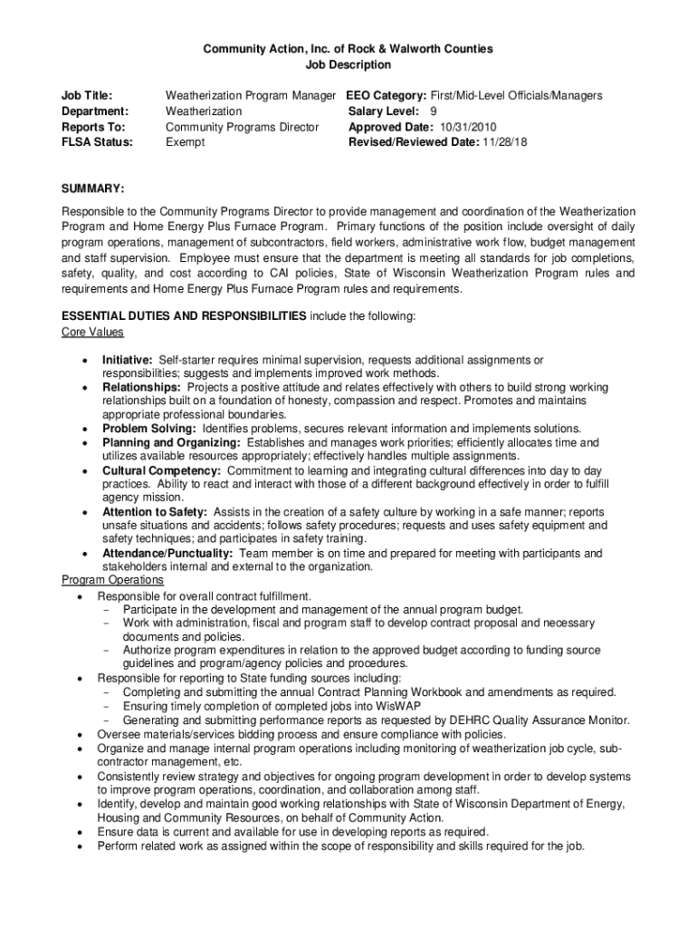 Community Action, Inc. of Rock & Tamworth Counties Job Description Job Title: Department: Reports To: FLEA Status:Weatherization Program Manager EEO Category: First/Level Officials/Managers Weatherization