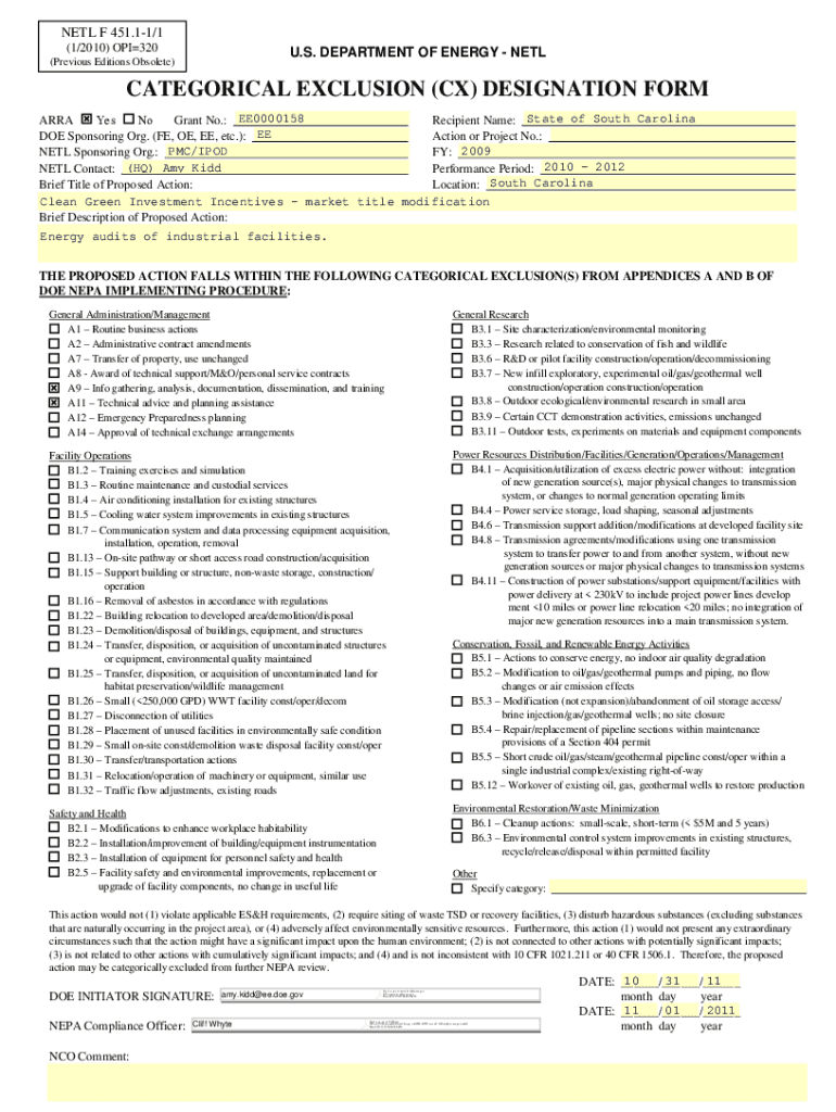 NET F 451.11/1 (1/2010) OPI320U. S. DEPARTMENT OF ENERGY NET(Previous Editions Obsolete)CATEGORICAL EXCLUSION (CX) DESIGNATION FORM AREA Yes No Grant No.: EE0000158 Recipient Name: State of South