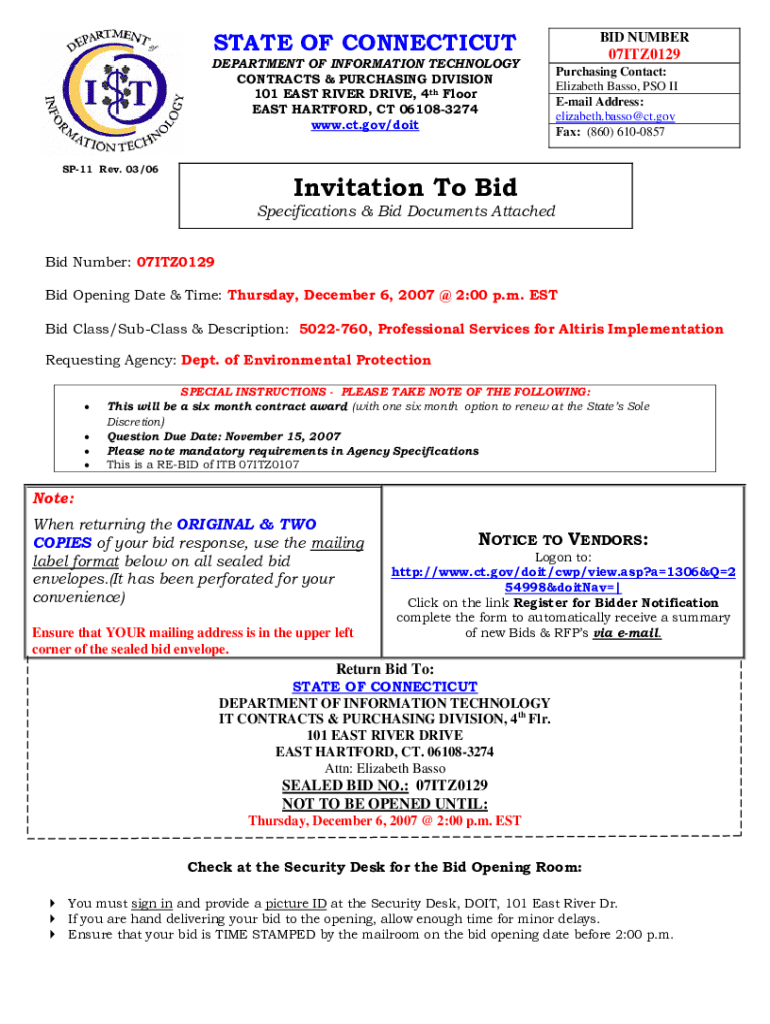 STATE OF CONNECTICUTDEPARTMENT OF INFORMATION TECHNOLOGY CONTRACTS & PURCHASING DIVISION 101 EAST RIVER DRIVE, 4th Floor EAST HARTFORD, CT 061083274 www.ct.gov/doit SP11 Rev. 03/06BID NUMBER07ITZ0129