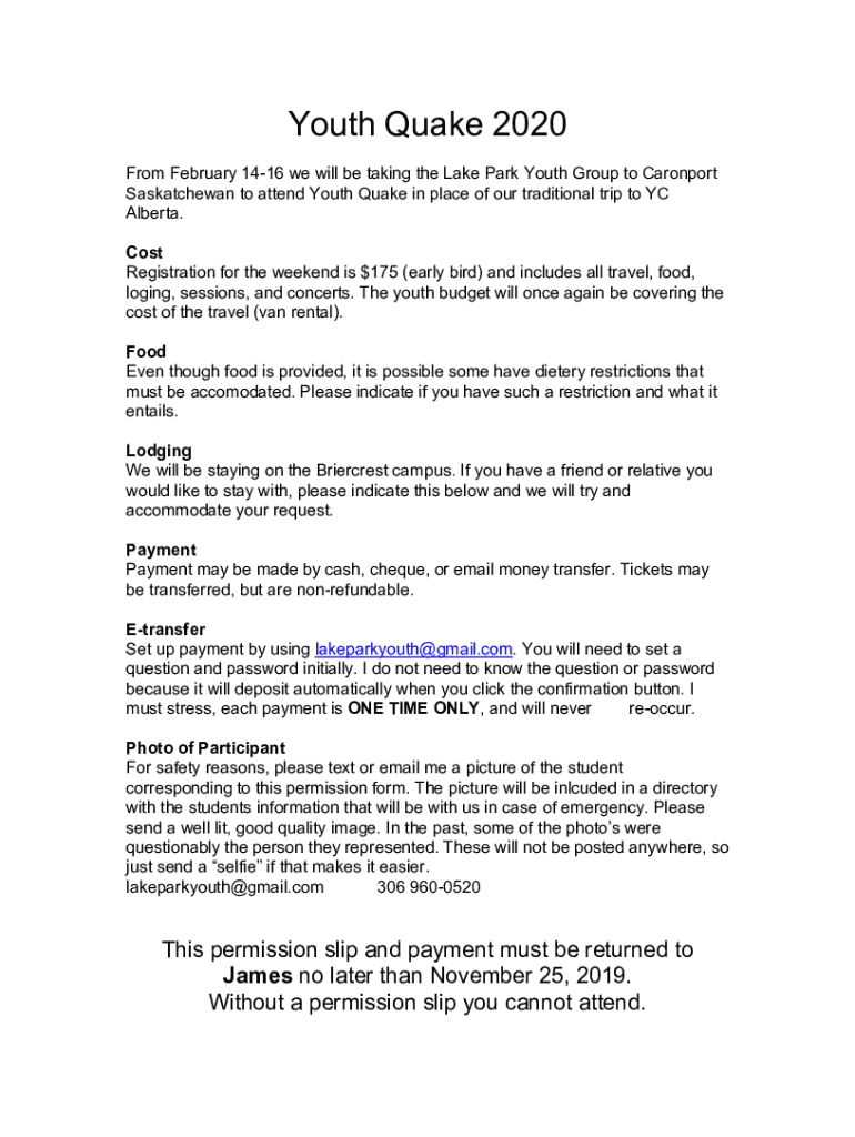 Youth Quake 2020 From February 1416 we will be taking the Lake Park Youth Group to Carport Saskatchewan to attend Youth Quake in place of our traditional trip to BC Alberta. Cost Registration for
