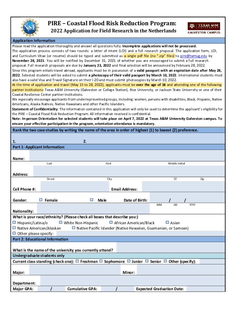 PIRE Coastal Flood Risk Reduction Program: 2022 Application for Field Research in the NetherlandsApplication InformationPlease read the application thoroughly and answer all questions fully. Incomplete