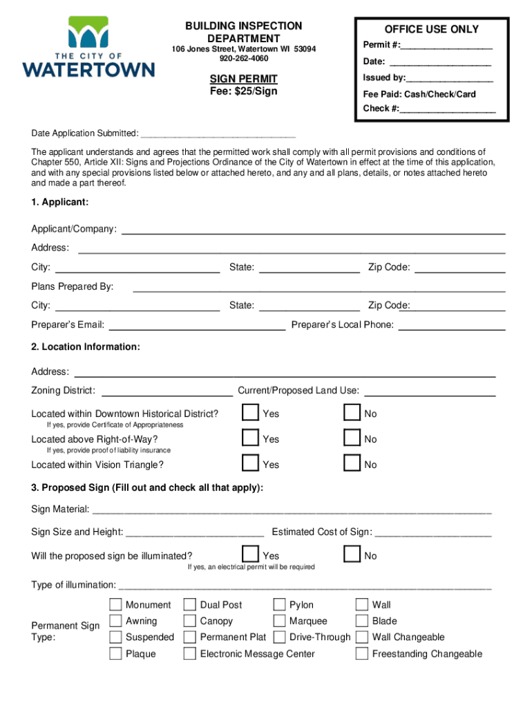 BUILDING INSPECTION DEPARTMENT 106 Jones Street, Watertown WI 53094 9202624060OFFICE USE ONLY Permit #:___ Date: ___ Issued by:___SIGN PERMIT Fee: $25/Signee Paid: Cash/Check/Card Check #:___Date