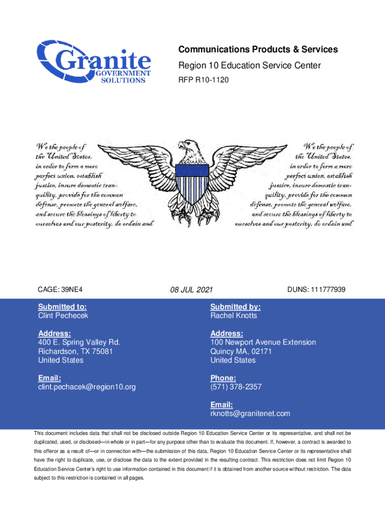 Communications Products & Services Region 10 Education Service Center RFP R101120CAGE: 39NE408 JUL 2021DUNS: 111777939Submitted to: Clint PechecekSubmitted by: Rachel KnottsAddress: 400 E. Spring