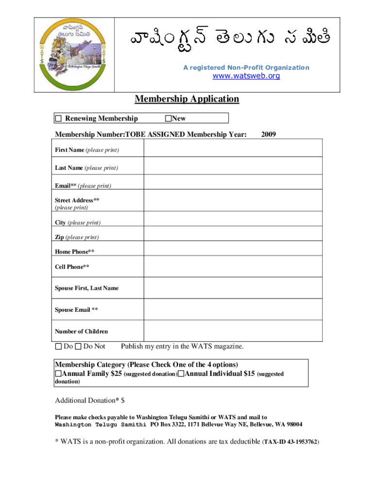 A registered Nonprofit Organization.water.membership Application Renewing Membership New Membership. Membership Number:TONE ASSIGNED Membership Year:2009First Name (please print) Last Name (please