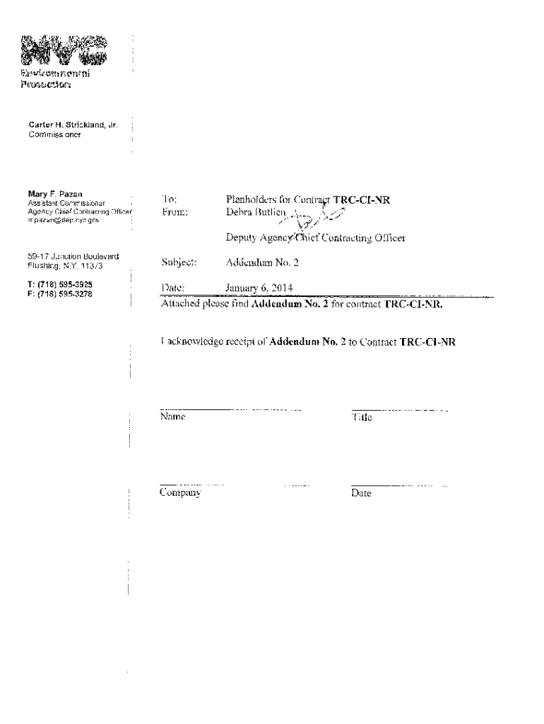 CONSTRUCTION CONTRACT5917 Junction Boulevard Elmhurst, New York 11373 Carter H. Strickland, Jr. Commissioner Mary Pagan Agency Chief Contracting OfficerADDENDUM TO CONTRACT DOCUMENTS NUMBER 2 FOR