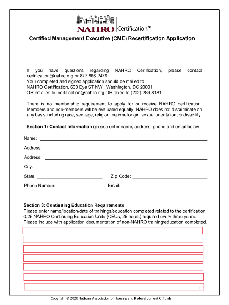 Certified Management Executive (CME) Recertification Application you have questions regarding NAH RO Certification, certification@nahro.org or 877.866.2476. Your completed and signed application should