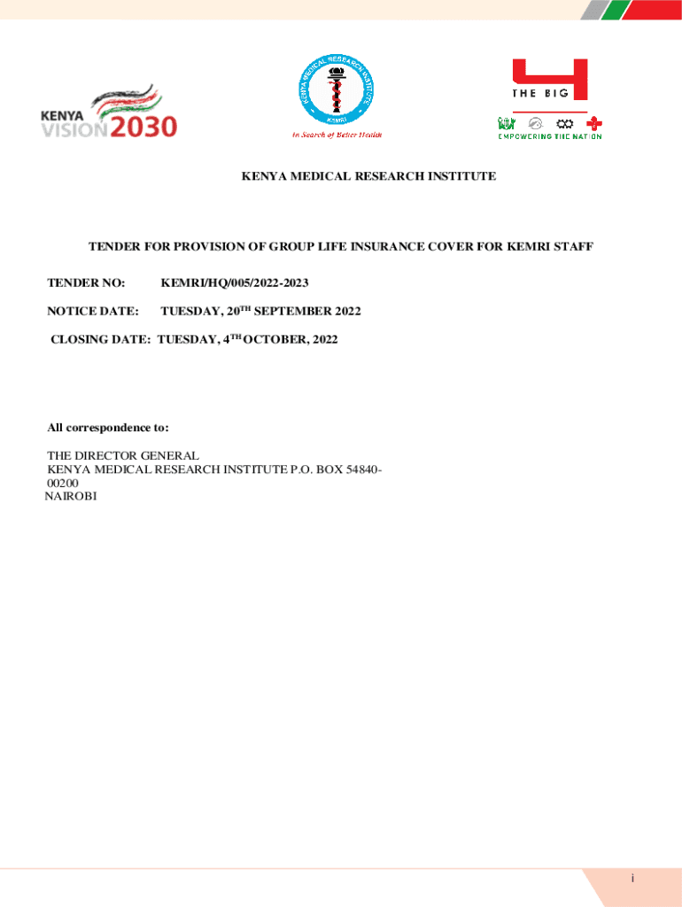 KENYA MEDICAL RESEARCH INSTITUTETENDER FOR PROVISION OF GROUP LIFE INSURANCE COVER FOR KERI STAFF TENDER NO:KERI/HQ/005/20222023NOTICE DATE:TUESDAY, 20TH SEPTEMBER 2022CLOSING DATE: TUESDAY, 4TH OCTOBER,