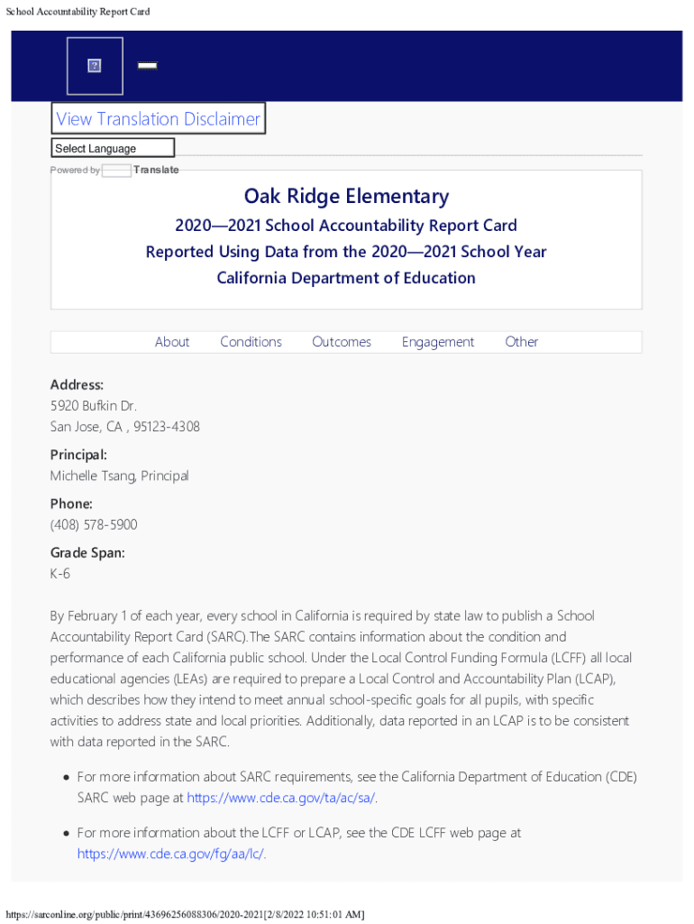 School Accountability Report Cardie TRANSLATION DISCLAIMER View Translation Disclaimer Select Language Powered byTranslateOak Ridge Elementary20202021 School Accountability Report CardReported Using