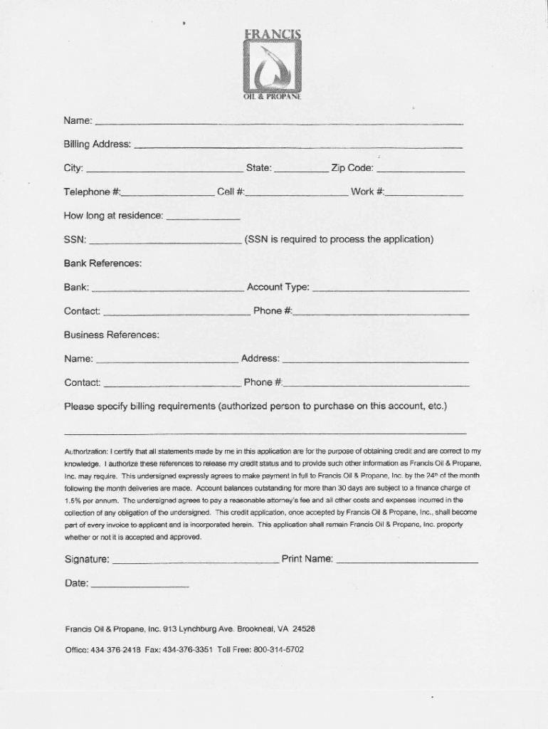 Name:__Billing Address:_City:State:Telephone #:, Zip Code:Cell #:How long at residence:_Work #:, __SSN:(SSN is required to process the application)Bank References: Bank:AccoumType:_Phone #:Contact:_Business