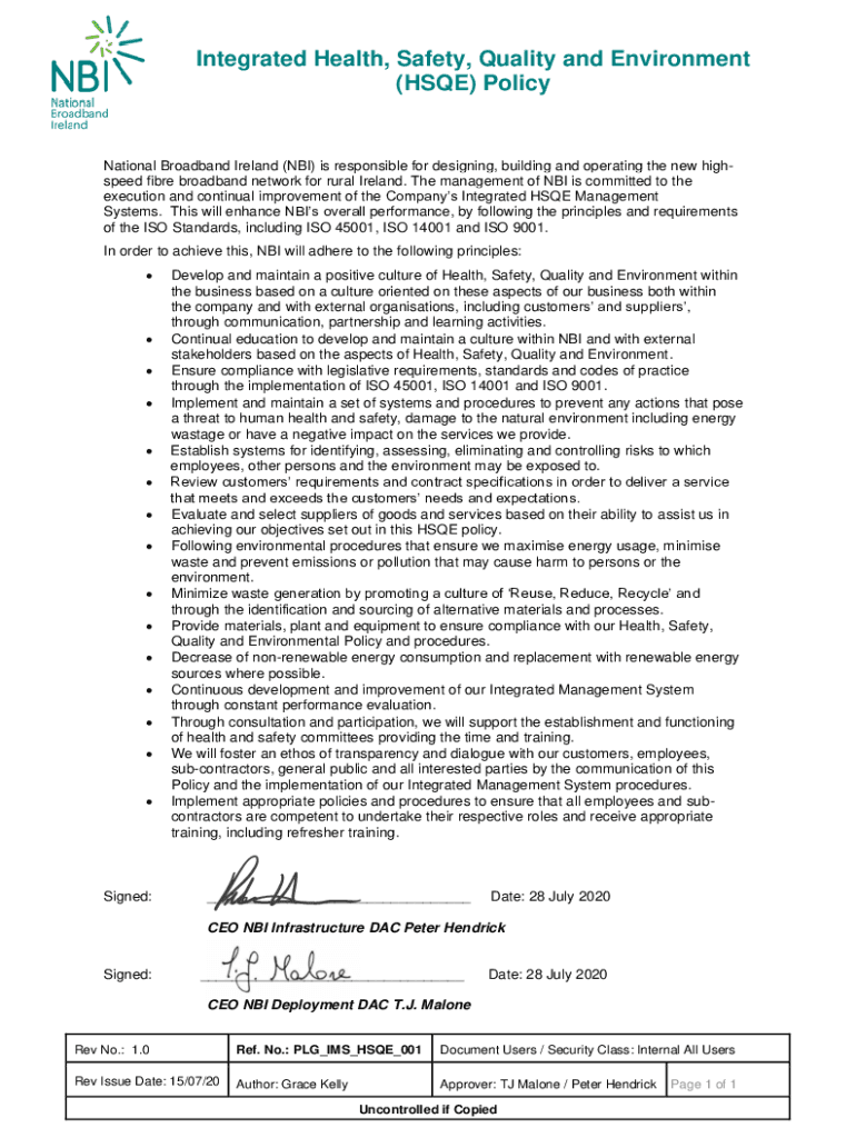 Integrated Health, Safety, Quality and Environment (HSE) PolicyNational Broadband Ireland (FBI) is responsible for designing, building and operating the new high speed fiber broadband network for