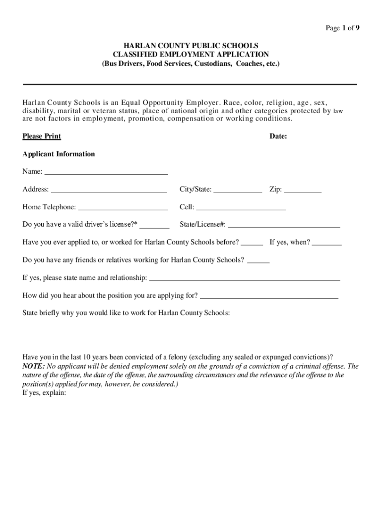 Page 1 of 9 HARLAN COUNTY PUBLIC SCHOOLS CLASSIFIED EMPLOYMENT APPLICATION (Bus Drivers, Food Services, Custodians, Coaches, etc.) Harlan County Schools is an Equal Opportunity Employer. Race, color,