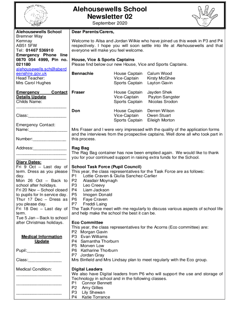 Alehouse wells School Newsletter 02 September 2020 Alehouse wells School Brenner Way Kenny AB51 5FW Tel: 01467 536910 Emergency Phone line 0870 054 4999, Pin no. 021180 alehouse wells. Schreiber entire.gov.UK