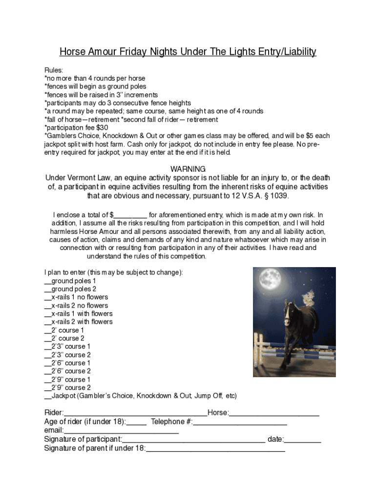Horse Amour Friday Nights Under The Lights Entry/Liability Rules: *no more than 4 rounds per horse *fences will begin as ground poles *fences will be raised in 3 increments *participants may do 3