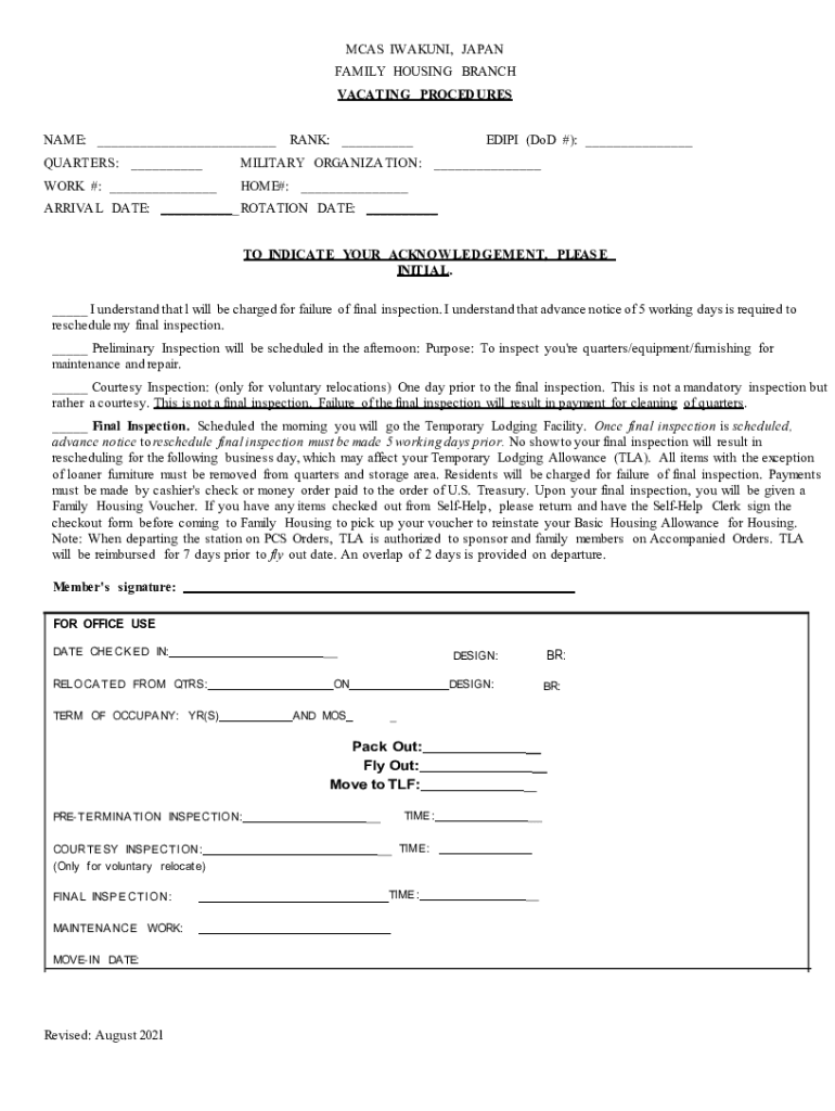 MCAS AWAKEN, JAPAN FAMILY HOUSING BRANCH VACATING PROCEDURES NAME: ___RANK: ___EDIPI (DoD #): ___QUARTERS: ___MILITARY ORGAN NINA TON: ___WORK #: ___HOME#: ___ARRIVAL L DATE: ___ ROTATION DATE: ___