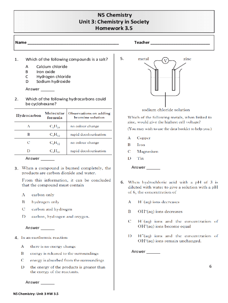 N5 Chemistry Unit 3: Chemistry in Society Homework 3.5 Name ___1. Which of the following compounds is a salt? A B CD Teacher ___5. Calcium chloride Iron oxide Hydrogen chloride Sodium hydroxideAnswer