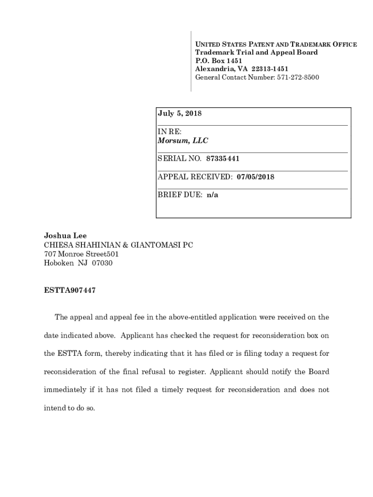 UNITED STATES PATENT AND TRADEMARK OFFICE Trademark Trial and Appeal Board P.O. Box 1451 Alexandria, VA 223131451 General Contact Number: 5712728500July 5, 2018 ___ IN RE: Dorsum, LLC ___ SERIAL NO.