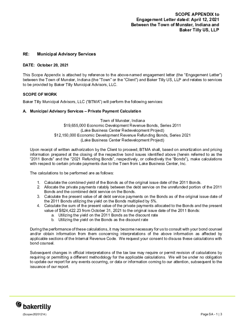 SCOPE APPENDIX to Engagement Letter dated: April 12, 2021, Between the Town of Munster, Indiana and Baker Tilly US, LL PRE:Municipal Advisory ServicesDATE: October 20, 2021, This Scope Appendix is