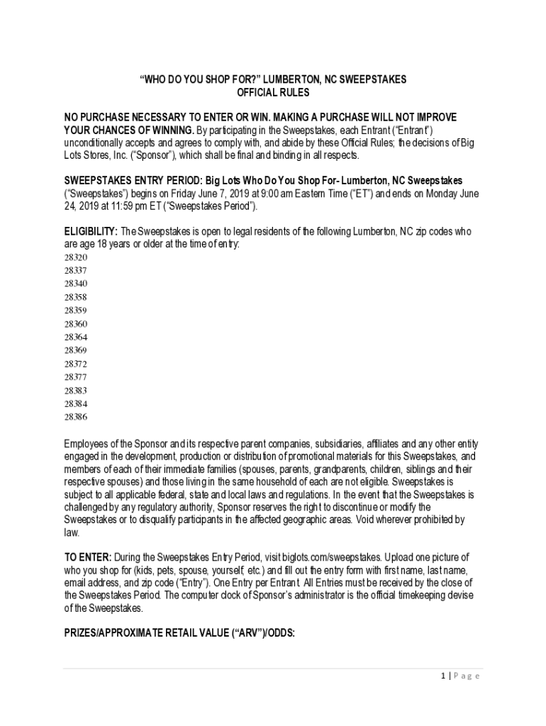 WHO DO YOU SHOP FOR? LUMBERTON, NC SWEEPSTAKES OFFICIAL RULES NO PURCHASE NECESSARY TO ENTER OR WIN. MAKING A PURCHASE WILL NOT IMPROVE YOUR CHANCES OF WINNING. By participating in the Sweepstakes,