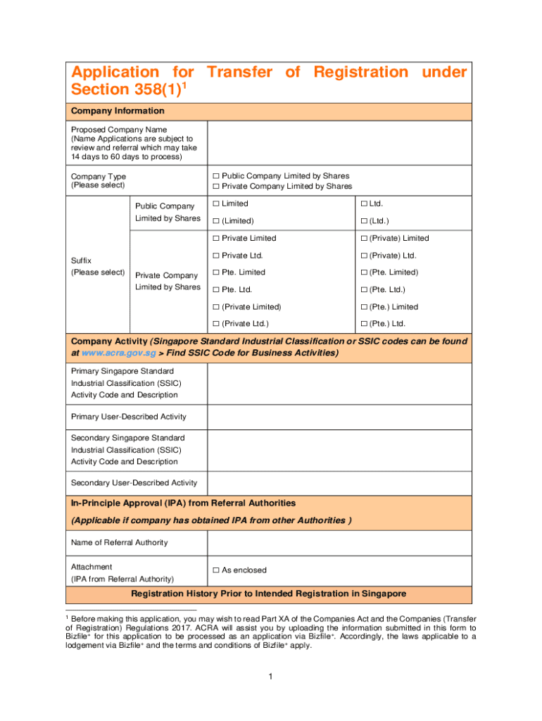 Application for Transfer of Registration under Section 358(1)1 Company Information Proposed Company Name (Name Applications are subject to review and referral which may take 14 days to 60 days to