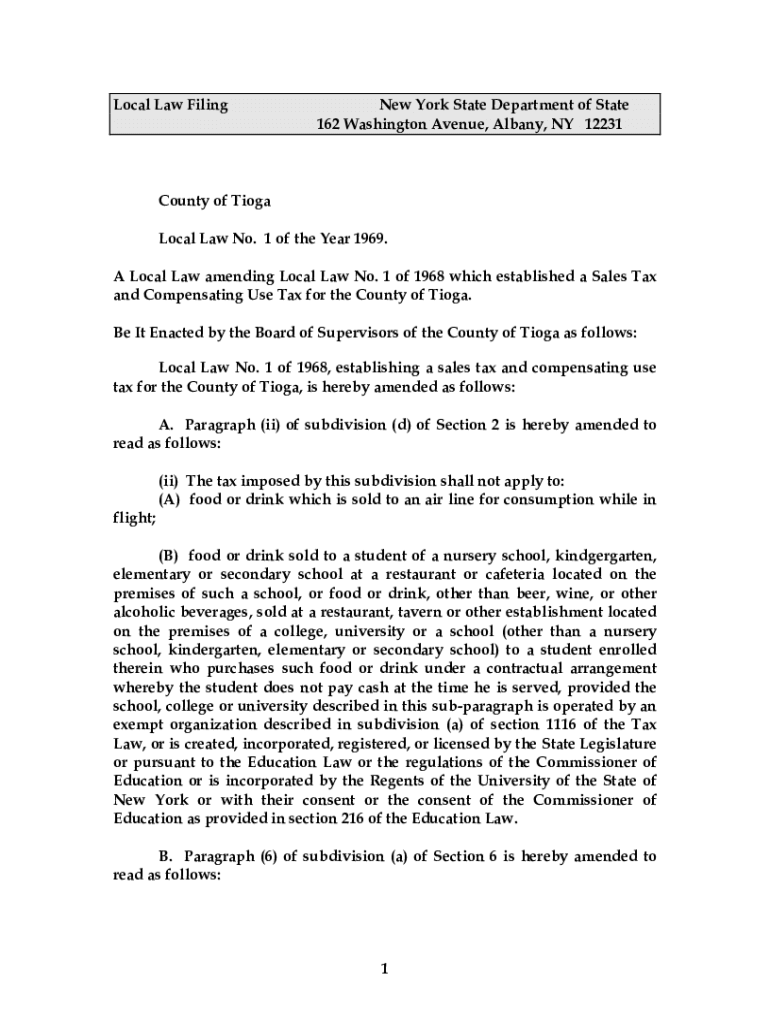 Local Law Filing York State Department of State 162 Washington Avenue, Albany, NY 12231County of Toga Local Law No. 1 of the Year 1969. A Local Law amending Local Law No. 1 of 1968 which established