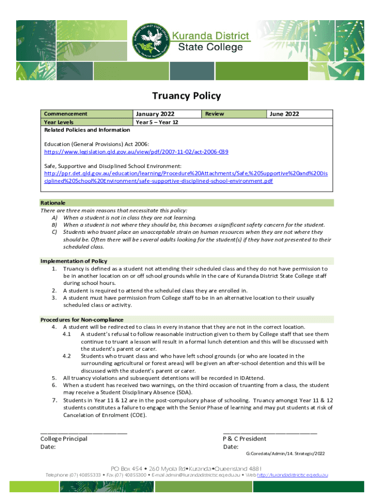 Get the free Truancy Policy - Kuranda District State College - kurandadistrictsc eq edu