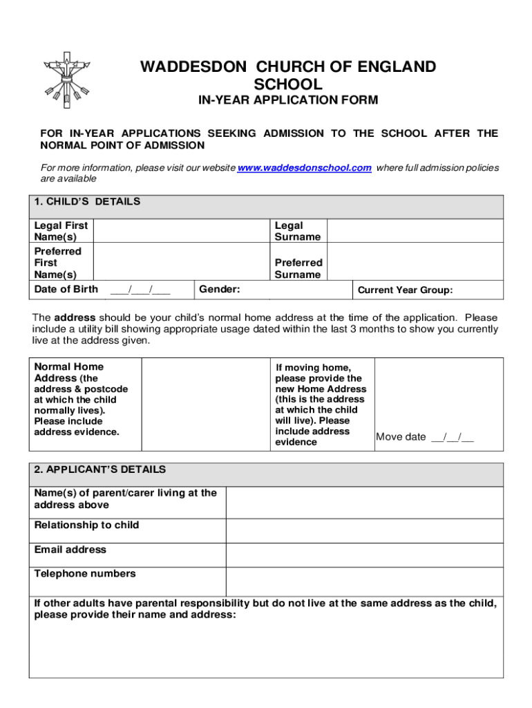 ADHESION CHURCH OF ENGLAND SCHOOL IN-EAR APPLICATION FORM FOR IN-EAR APPLICATIONS SEEKING ADMISSION TO THE SCHOOL AFTER THE NORMAL POINT OF ADMISSION For more information, please visit our website