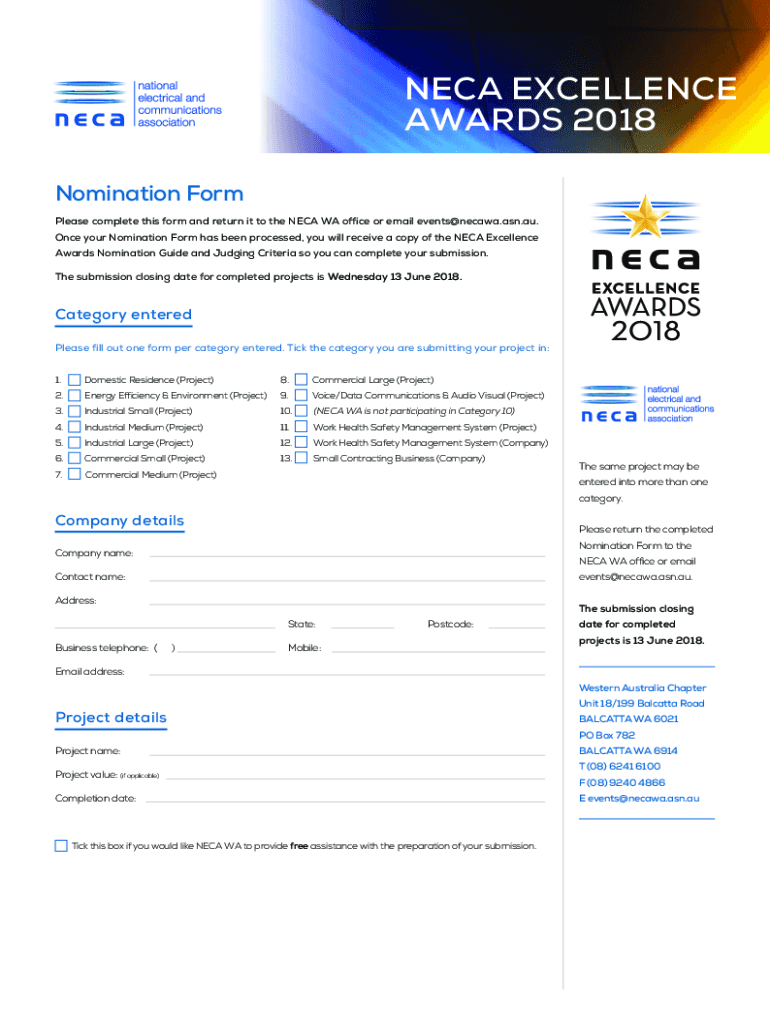NECK EXCELLENCE AWARDS 2018 Nomination Form Please complete this form and return it to the NEC AWA office or email events@necawa.asn.au. Once your Nomination Form has been processed, you will receive