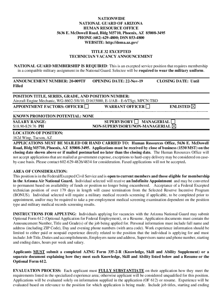NATIONWIDE NATIONAL GUARD OF ARIZONA HUMAN RESOURCE OFFICE 5636 E. McDowell Road, Bldg M5710, Phoenix, AZ 850083495 PHONE (602) 6294800; DSN 8534800 WEBSITE: http://dema.az.gov/ TITLE 32 EXCEPTED