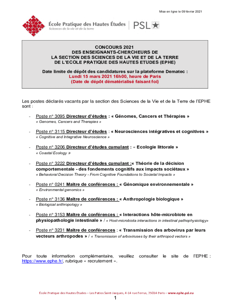 Mile en line LE 09 frier 2021CONCOURS 2021 DES ENSEIGNANTSCHERCHEURS DE LA SECTION DES SCIENCES DE LA VIE ET DE LA TERRY DE BECOME CRITIQUE DES HATES Études (EPHE) Date limited DE dpt DES candidatures