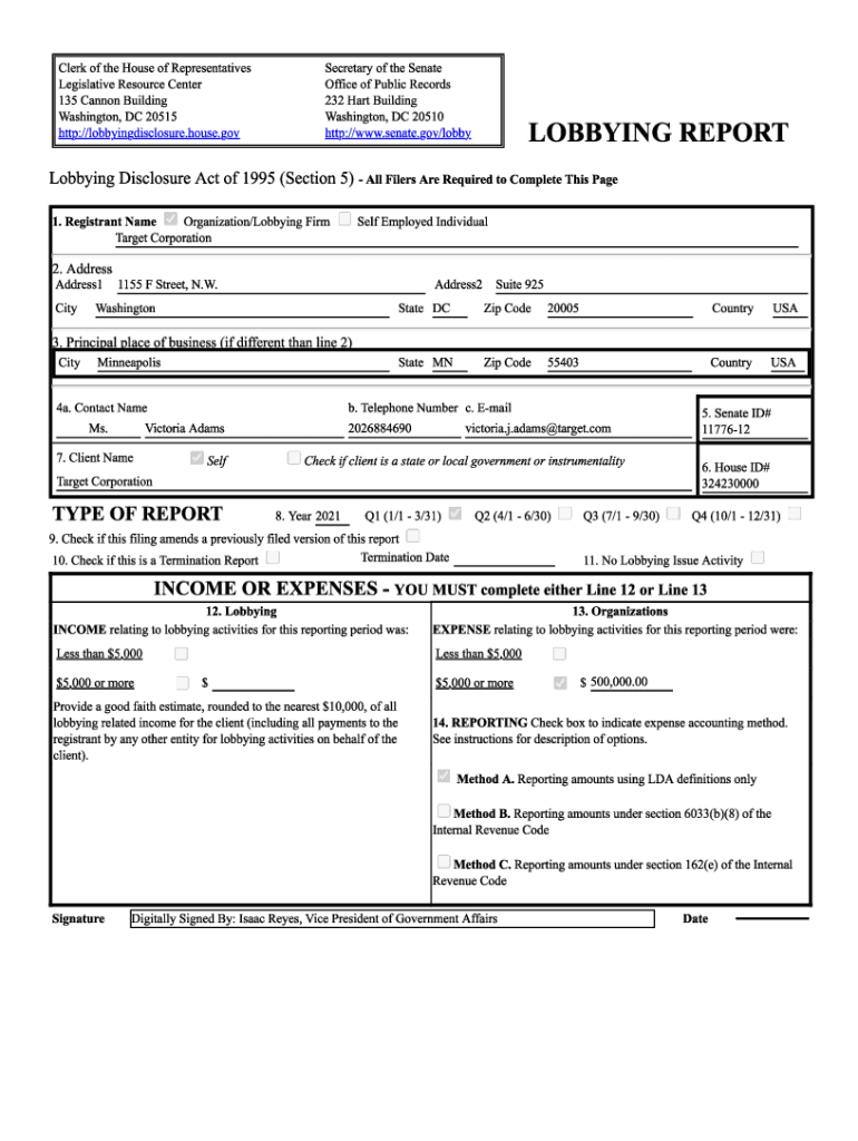 Clerk of the House of Representatives Legislative Resource Center 135 Cannon Building Washington, DC 20515 http://lobbyingdisclosure.house.govSecretary of the Senate Office of Public Records 232 Hart