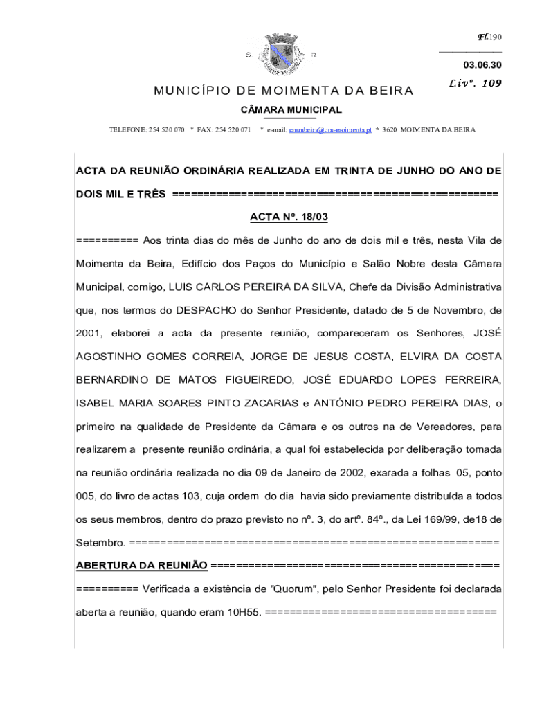 Fl. Fl 190 ___03.06.30MU NI C P I O DE MO I M E N TA DA B E I R AL i v. 1 0 9CMARA MUNICIPAL TELEPHONE: 254 520 070 * FAX: 254 520 071* email: cmmbeira@cmmoimenta.pt * 3620 MOMENTA DA BEIRAACTA DA