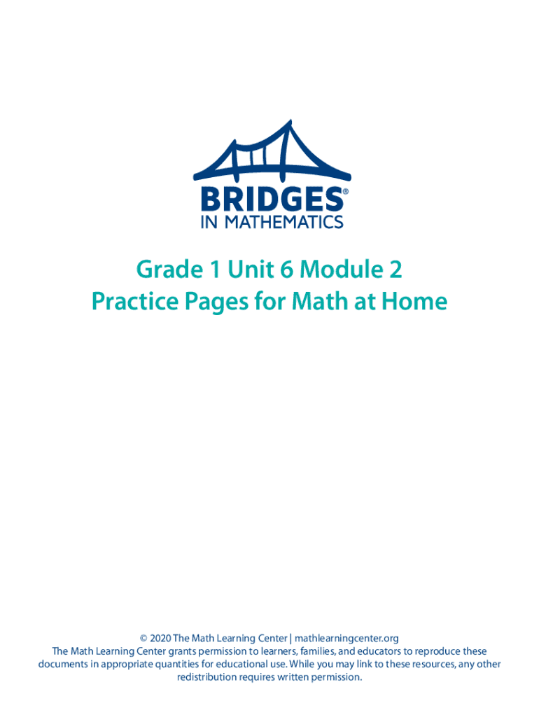 Grade 1 Unit 6 Module 2 Practice Pages for Math at Home 2020 The Math Learning Center | mathlearningcenter.org The Math Learning Center grants permission to learners, families, and educators to reproduce