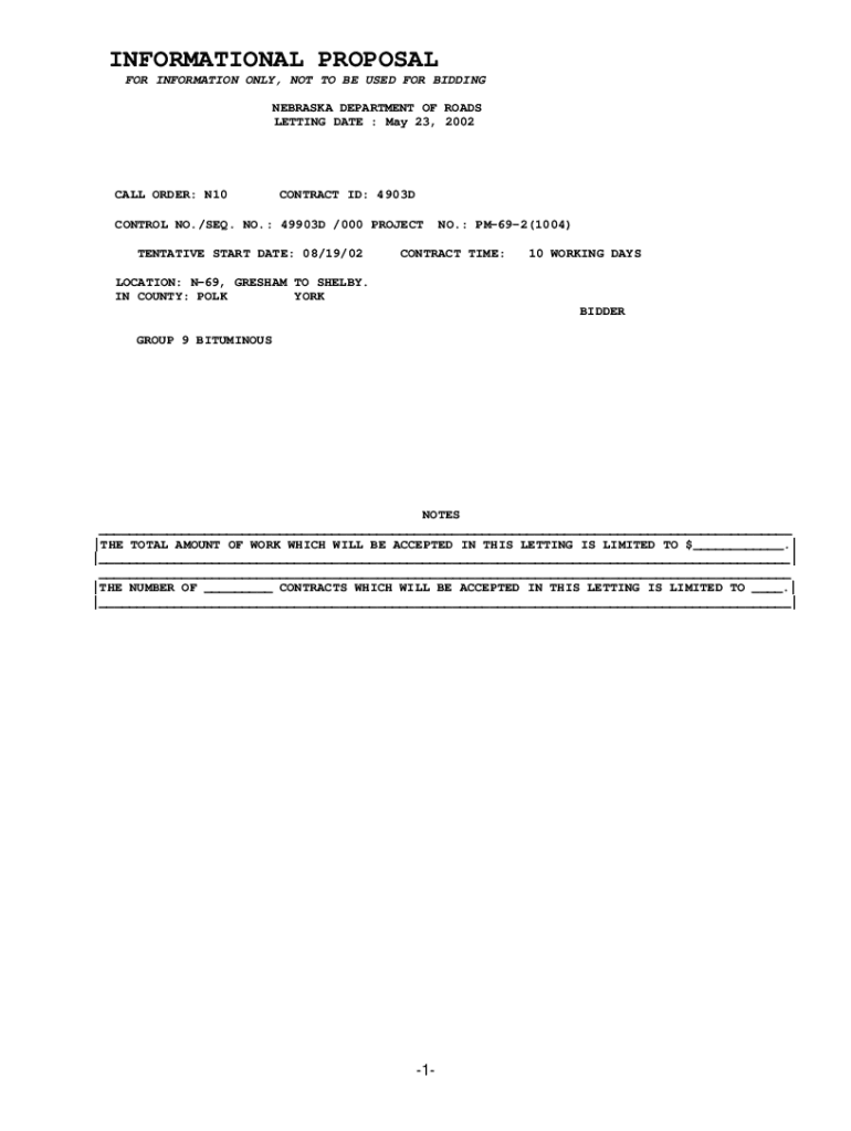INFORMATIONAL PROPOSAL FOR INFORMATION ONLY, NOT TO BE USED FOR BIDDING NEBRASKA DEPARTMENT OF ROADS LETTING DATE : May 23, 2002CALL ORDER: N10CONTRACT ID: 4903DCONTROL NO./SEQ. NO.: 49903D /000 PROJECT