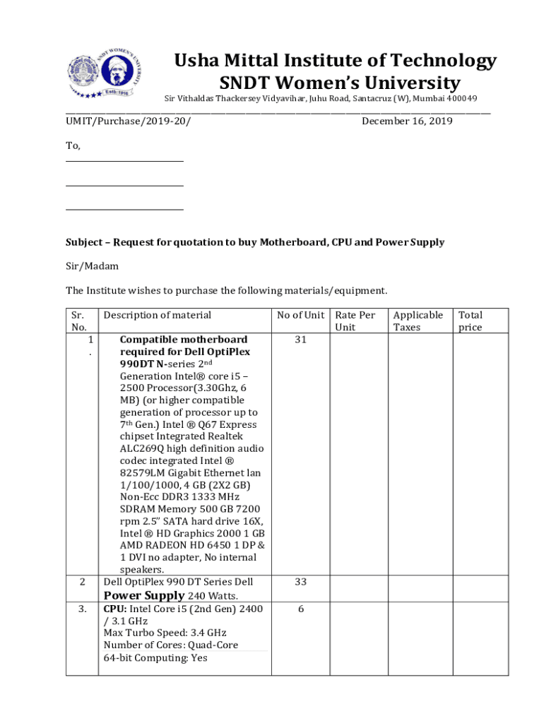 USA Mitral Institute of Technology SNOT Women's University Sir Vitals Thackeray Vidyavihar, JHU Road, Santacruz (W), Mumbai 400049___UNIT/Purchase/201920/December 16, 2019To, ___ ___ ___ Subject Request