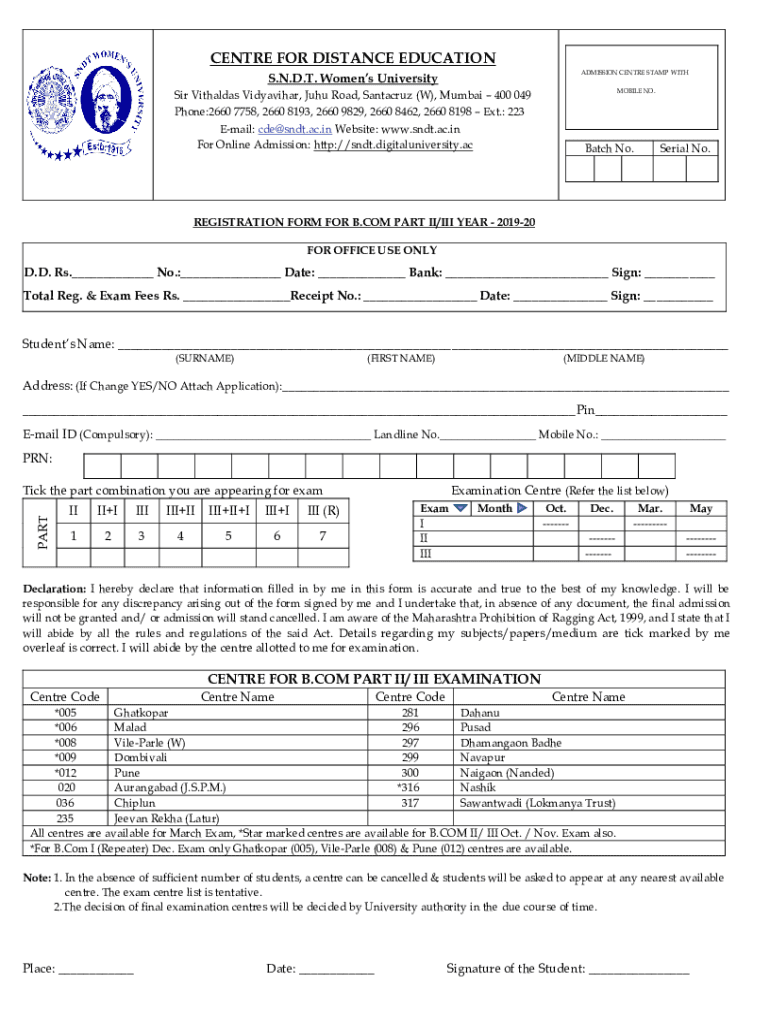 Center FOR DISTANCE EDUCATION S.N.D.T. Women's UniversityADMISSION Center STAMP WITH Sir Vitals Vidyavihar, JHU Road, Santacruz (W), Mumbai 400 049 Phone:2660 7758, 2660 8193, 2660 9829, 2660 8462,