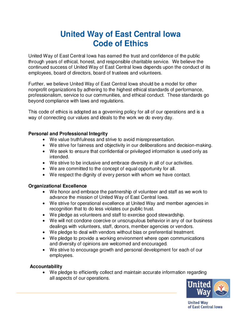 United Way of East Central Iowa Code of Ethics United Way of East Central Iowa has earned the trust and confidence of the public through years of ethical, honest, and responsible charitable service.