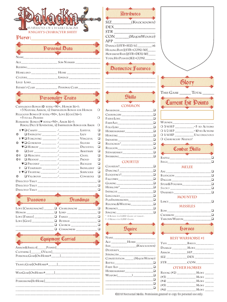 AttributesKnights Character SHeetPlayer:___ Personal Data Name___SIZ ___(Knockdown) EX ___ STR ___ CON ___(Major Wound) APP ___ Damage [(STR+SIX)/6] ___ d6 Healing Rate [(STR+CON)/10] ___ Movement