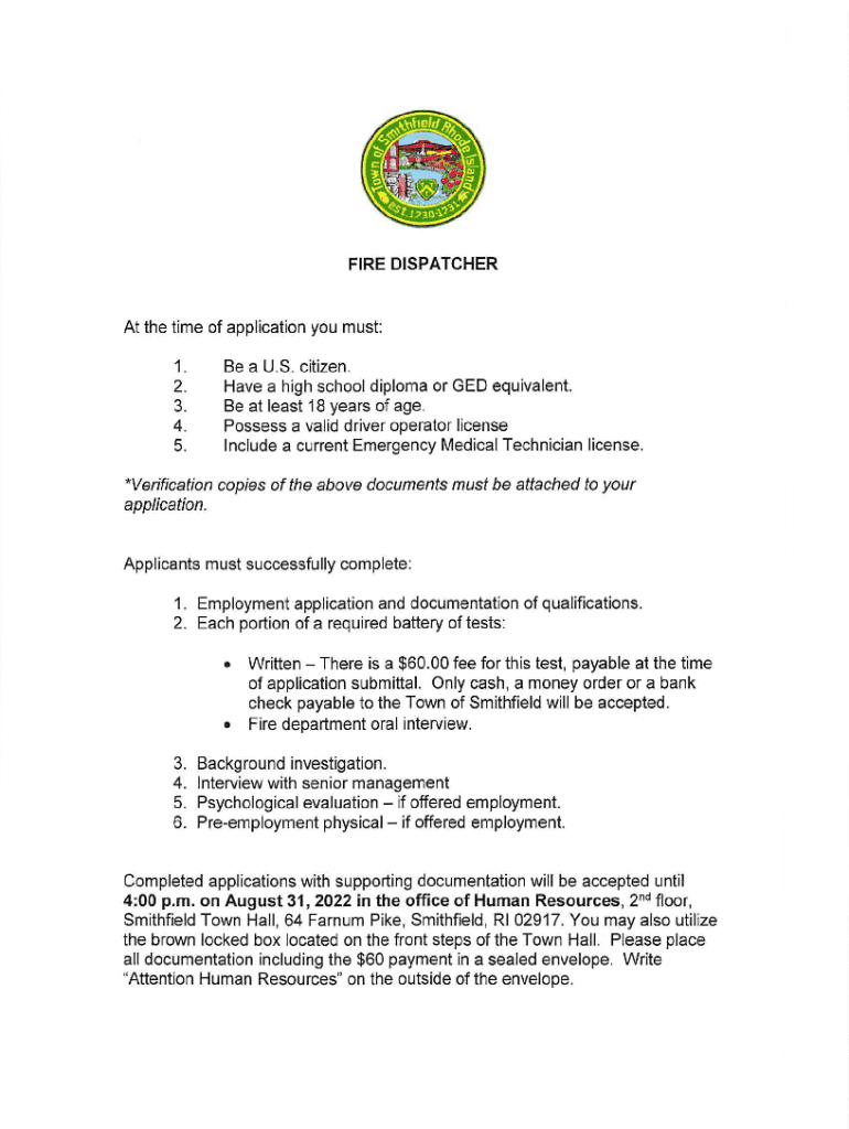 FIRE DISPATCHER At the time of application you must: 1. 2. 3. 4. 5. Be a U.S. citizen. Have a high school diploma or GED equivalent. Be at least 18 years of age. Possess a valid driver operator license