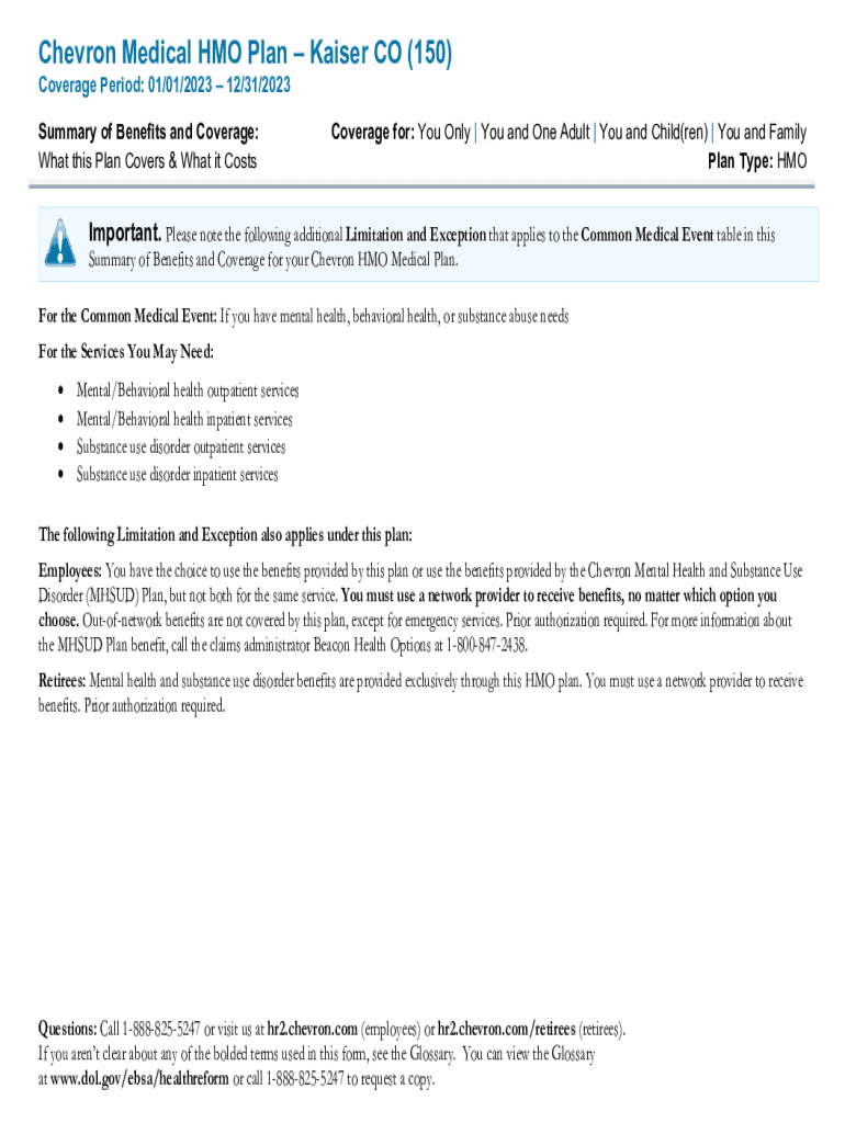 Chevron Medical HMO Plan Kaiser CO (150) Coverage Period: 01/01/2023 12/31/2023 Summary of Benefits and Coverage: What this Plan Covers & What it CostsCoverage for: You Only | You and One Adult |