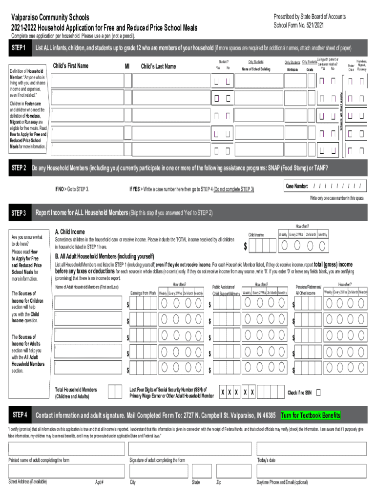 Valparaiso Community Schools 20212022 Household Application for Free and Reduced Price School MealsPrescribed by State Board of Accounts School Form No. 521/2021Complete one application per household.