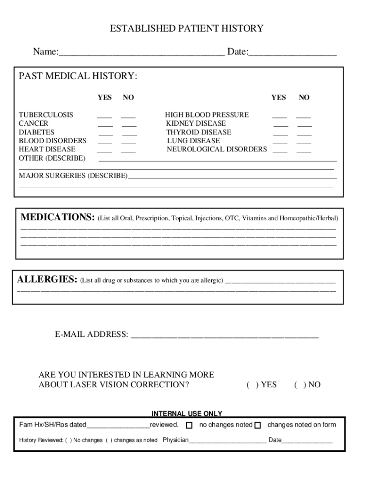 ESTABLISHED PATIENT HISTORY Name:___ Date:___ PAST MEDICAL HISTORY: YESNOYESNOTUBERCULOSIS ___ ___ HIGH BLOOD PRESSURE ___ ___ CANCER ___ ___ KIDNEY DISEASE ___ ___ DIABETES ___ ___ THYROID DISEASE