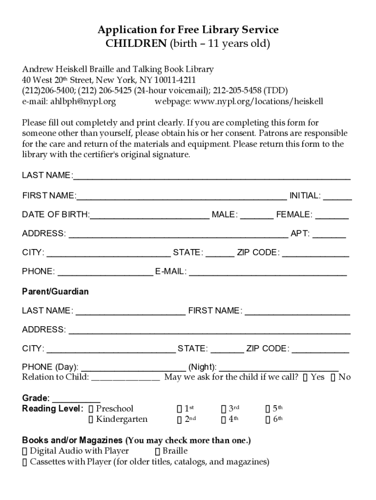 Application for Free Library Service CHILDREN (birth 11 years old) Andrew Haskell Braille and Talking Book Library 40 West 20th Street, New York, NY 100114211 (212)2065400; (212) 2065425 (24hour voicemail);