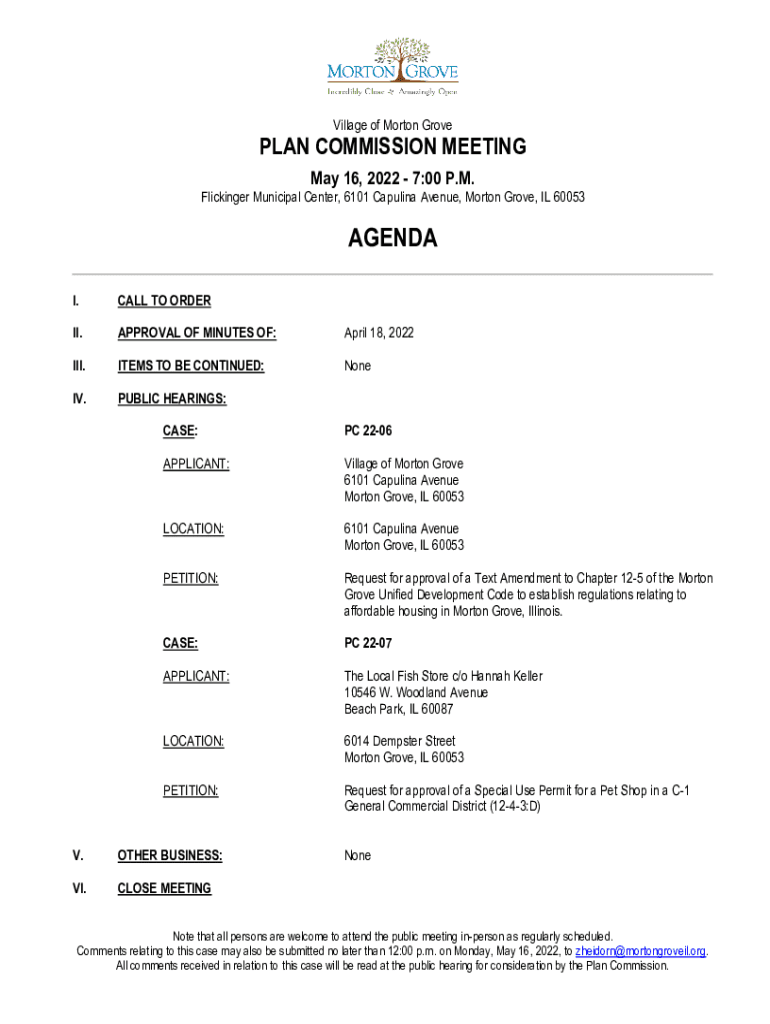 Village of Morton Grovel COMMISSION MEETING May 16, 2022 7:00 P.M. Flicking her Municipal Center, 6101 Carolina Avenue, Morton Grove, IL 60053AGENDA I.CALL TO ORDER.APPROVAL OF MINUTES OF:April 18,