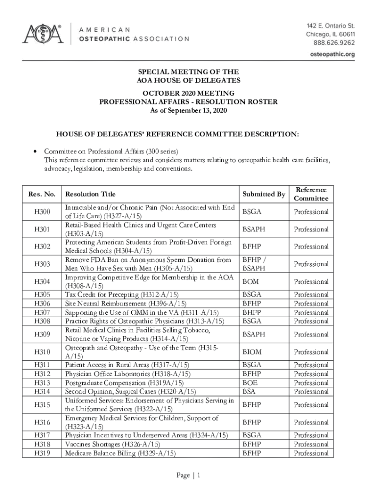 SPECIAL MEETING OF THE AOA HOUSE OF DELEGATES OCTOBER 2020 MEETING PROFESSIONAL AFFAIRS RESOLUTION ROSTER As of September 13, 2020, HOUSE OF DELEGATES REFERENCE COMMITTEE DESCRIPTION: Committee on