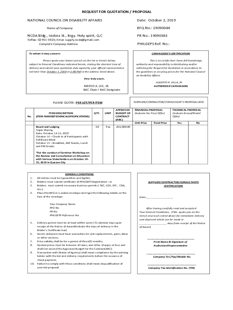 REQUEST FOR QUOTATION / PROPOSAL NATIONAL COUNCIL ON DISABILITY AFFAIRSDate: October 2, 2019, RFQ No.: 19090044Name of CompanyNCDA Bldg., Isidora St., Bray. Holy Spirit, Q.CPR No.: 19090383Telfax: