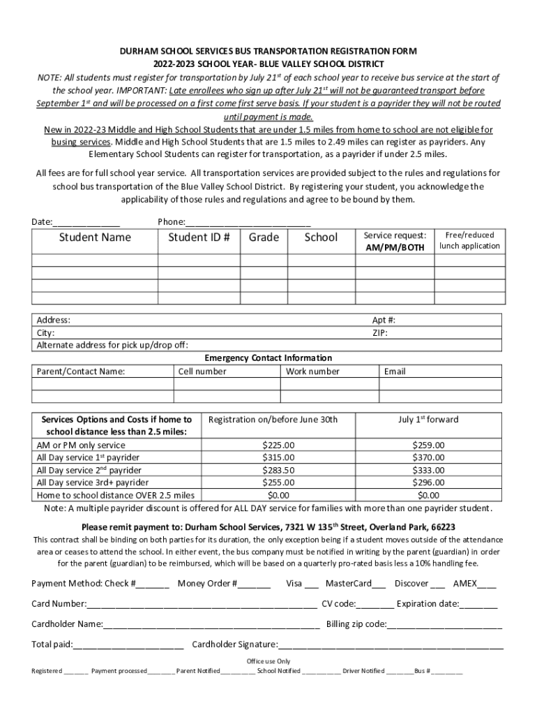 DURHAM SCHOOL SERVICES BUS TRANSPORTATION REGISTRATION FORM 20222023 SCHOOL YEAR BLUE VALLEY SCHOOL DISTRICT NOTE: All students must register for transportation by July 21st of each school year to