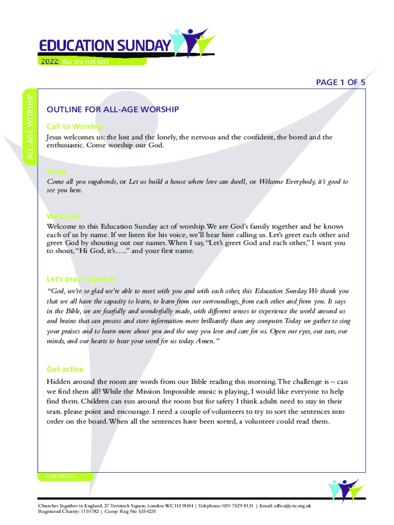 ALLEGE WORSHIPING 1 OF 5 OUTLINE FOR ALLEGE WORSHIP Call to Worship Jesus welcomes us: the lost and the lonely, the nervous and the confident, the bored and the enthusiastic. Come worship our God.