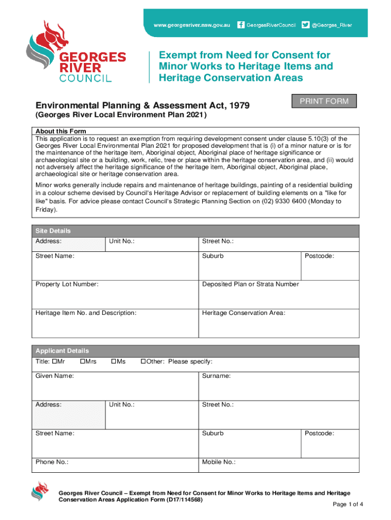 Exempt from Need for Consent for Minor Works to Heritage Items and Heritage Conservation Areas Environmental Planning & Assessment Act, 1979PRINT FORM(Georges River Local Environment Plan 2021) About